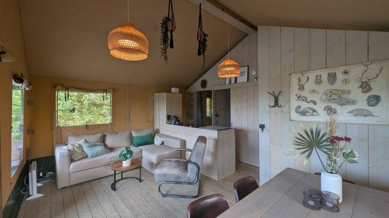 De Safari Lodge is geschikt voor maximaal 5 personen en voorzien van een riante leefruimte met gezellige zithoek. De Lodge heeft twee slaapkamers: een slaapkamer met een twee-persoonsbed en een slaapkamer met stapelbed voor drie personen. Het is mogelijk om bedlinnen voor €11 per persoon per verblijf bij te boeken. Koken doe je in de volledig uitgeruste keuken, voorzien van o.a. koelkast met diepvries, afwasmachine, combimagnetron, waterkoker en een Senseo koffieapparaat. Voor de wat koudere avonden en nachten zijn er binnen twee kachels aanwezig die iedereen extra warm houden en lekkere warme en zachte fleecedekens.